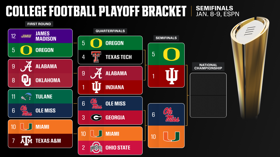 O décimo colocado Miami se tornou o primeiro cabeça de chave de dois dígitos na era dos 12 times a cair nas semifinais, abrindo caminho em campo ao derrotar o atual campeão nacional Ohio State por 24 a 14 na véspera de Ano Novo. Miami enfrentará Ole Miss no Vrbo Fiesta Bowl em 8 de janeiro (7h30 horário do leste dos EUA, ESPN). O técnico do Hurricanes, Mario Cristobal, em sua primeira aparição nos playoffs, enfrenta o novo técnico dos Rebels, Pete Golding, que pilotou Ole Miss em águas agitadas após a saída de Lane Kiffin na novela.