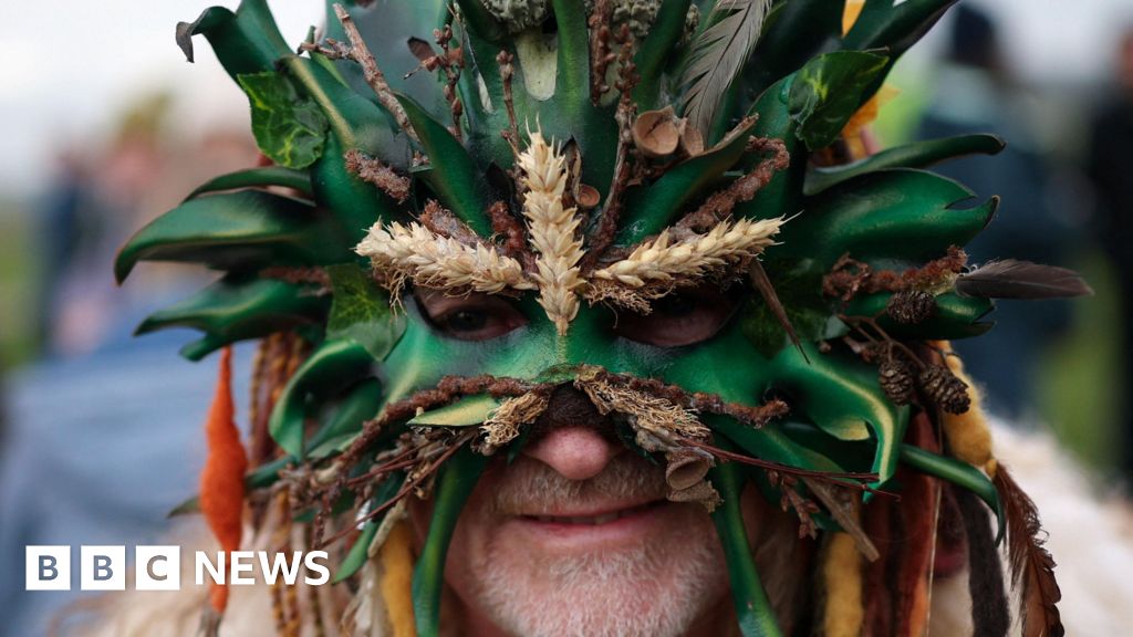 Vestindo roupas celtas e toucados elaborados inspirados na natureza, druidas e pagãos dançavam ao redor do círculo de pedras neolítico em Wiltshire, que se acredita ter sido construído por ancestrais distantes para se alinhar com os movimentos do Sol.